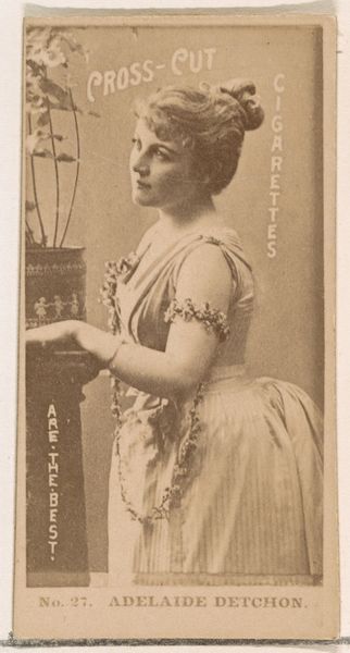 Curator: Look at this curious little card, found in the Met. "Card Number 319, Isabella Terrise, from the Actors and Actresses series," printed by W. Duke, Sons & Co. in the 1880s as an advertisement for Cross-Cut Cigarettes. Editor: It feels oddly intimate for something that was essentially a promotional item. The muted sepia tones and the soft focus give it a wistful, dreamlike quality. What strikes me most is the bird she's holding – there's this unexpected vulnerability about it. Curator: Indeed, the bird introduces a delicate interplay of symbolism. Birds have long been associated with freedom, the soul, and even prophecy. Consider the actress's connection to it – perhaps a metaphor for her own transient existence, flitting from role to role, stage to stage. Editor: Right. I also see a strange connection with images from ukiyo-e – like, here, the focus shifts to an element seemingly outside of the portrait. Like a poem by Basho that moves from a macro-scale subject to a micro-scale element almost imperceptibly. Curator: It also makes one wonder about the gaze in portraits. She's looking down at the bird; it makes the viewer feel like an intruder on her private world. This breaks from conventions, it allows you into her space without actually addressing you. Almost subversive for a piece of promotional material! Editor: Definitely. You think you're just grabbing a smoke, and boom – you’re contemplating life’s fleeting moments with Isabella. You start reflecting: "am I this bird, captive?" Pretty powerful marketing if you ask me. And a glimpse of this turn of the century where advertising still carried this whiff of artistic license. Curator: Precisely! This card isn’t just about selling cigarettes, it offers a little escape, a miniature world of art. I'm curious to learn more about Ms. Terrise and the characters she portrayed, or maybe the agency and intent that Duke and Sons put behind their production. Editor: A fascinating object. It holds, within its tiny frame, layers of symbolism and societal aspirations, as hazy and thought-provoking as, well, a plume of cigarette smoke.