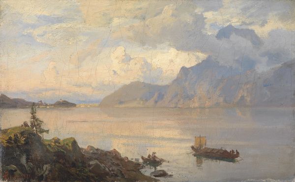 Amaldus Nielsen painted this oil on canvas in 1873, capturing a scene at Ølve in Norway under a sky heavy with grey weather. It’s a view that seems to speak to the heart of the country, a landscape whose identity is interwoven with the lives of its inhabitants. In the late 19th century, landscapes like this served as powerful symbols. Norway was in a period of national romanticism, seeking to define its unique identity amidst political unions with Sweden. Artists like Nielsen played a crucial role, visually articulating the nation's spirit through its majestic, often untamed, landscapes. The fishing boat, a humble vessel in this grand setting, quietly acknowledges the working lives tied to this terrain. Nielsen’s painting wasn’t just about scenery; it was about staking a claim to a cultural identity, one rooted in the land and the traditions it sustained. Understanding this work fully means diving into the archives, exploring the social and political currents that shaped its creation. The meaning of art is always contingent on such contexts.