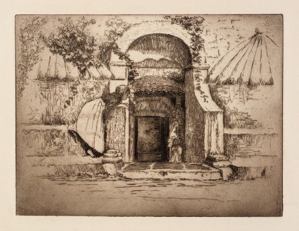 Curator: Before us is "The Doorway," an etching crafted around 1879 by James Abbott McNeill Whistler. Editor: There's a distinct melancholy emanating from this piece, don't you think? A certain hushed reverence achieved through the contrasting interplay of light and shadow, especially with all of the minute ornamental patterning and textured stonework on the facade surrounding that darker threshold. Curator: It certainly is evocative. Whistler was deeply interested in tonal harmonies. Look at how he balances the intricacies of the architectural details with those hazy, soft suggestions of form. It's a visual poem on architectural space, if you will. Notice how that deep recession pulls the eye? The use of chiaroscuro really models form as we explore the intricate ornamentation framing the titular subject: "The Doorway." Editor: The doorway almost seems to loom; the print makes excellent use of implied line with varying contrast. Whistler captures the mystique and ambience of old Europe masterfully. Was this work done during the artist's time in Venice? It has this very specific air of old-world charm with a hint of the clandestine—an interesting commentary, I think, about the power dynamics suggested through urban planning. These buildings, as symbols of Venetian power, seem quite vulnerable here, open to scrutiny. Curator: Exactly. This piece does hail from Whistler's Venetian period. He was commissioned to produce a set of etchings capturing scenes from Venice; however, rather than focusing on its iconic landmarks, he chose to portray the everyday lives of its inhabitants, often zeroing in on quieter corners. I mean, simply observe that subtle triangulation. What at first seems organic soon emerges as rigidly and geometrically organized; and, that play between geometry and the loose form of human beings creates something beyond mere picture making. Editor: The placement of figures really does seem to breathe life into the image and bring it into the real world. Instead of seeing Venetian grandiosity, the audience encounters working people trying to live, with dignity, under that symbolic weight of aristocracy and architectural power—an interesting human tension. Whistler appears to have used art as a method to communicate these complex relationships in a visually compelling way. I find his choice of subject, composition, and lighting nothing short of magnificent! Curator: I agree; the architectural framing is central to Whistler's ability to model complex perspectives—to both draw us in and make us conscious of his work as art. Editor: Overall, a powerful statement then, through deceptively simple means.