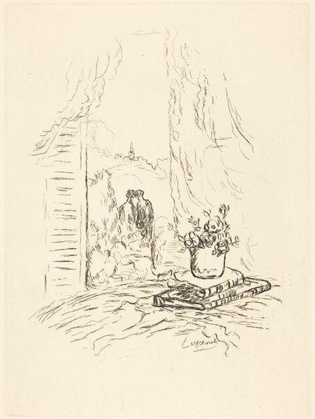 Pierre Laprade made this etching, "Vase of Flowers on Two Books," in the early 20th century. The image is created through a network of fine lines, made by incising a metal plate and then using it to transfer ink to paper. The apparent casualness of the composition belies the skill needed to produce it. Consider the implied labor: from mining and refining the metal of the plate, to the intellectual labor of writing and printing the books. The flowers themselves are of course natural, yet the vase is almost certainly industrially produced. The etching itself is not an editioned print, as Laprade has signed the sheet with his name. As such, it would have been priced as a unique artwork, and aimed at a discerning buyer. In the end, it's the accumulation of all these processes, both artistic and industrial, that gives the image its meaning.
