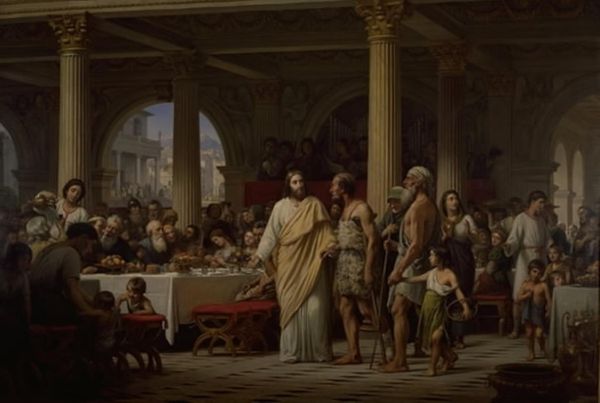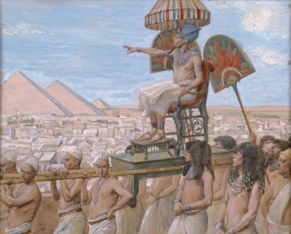 James Tissot's watercolor, "Moses Speaks to Pharaoh," uses precise lines and a muted palette to depict a scene of confrontation. Notice how the composition is structured around a stark contrast: on the left, the rigid, angular figure of Pharaoh embodies authority, while on the right, the flowing, softer forms of Moses and Aaron suggest divine influence. Tissot masterfully employs formal elements to underscore a narrative about power and resistance. Consider the vertical lines of the columns and the figures, which create a sense of architectural and moral order. Yet, this order is destabilized by the tension between the figures; Pharaoh's dismissive gesture contrasts with Moses's raised hand, a sign of his appeal to a higher power. Ultimately, Tissot's formalism in color and composition challenges the viewer to interpret the cultural codes and power dynamics at play. The artwork functions as a semiotic field, with each element—gesture, color, line—contributing to a complex discourse on faith, authority, and the struggle for liberation.