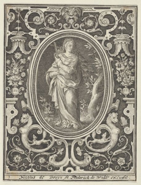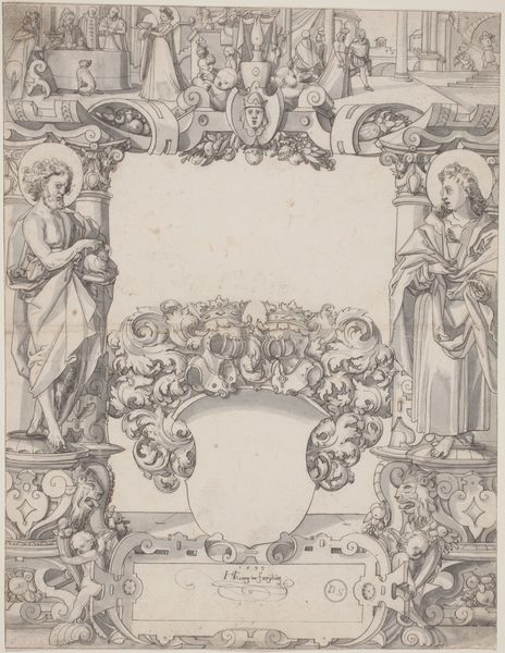This drawing of St. Cecilia is made with pen and black ink, with gray wash, over black chalk on paper. Notice how the composition is structured with a complex interplay of shapes and textures. The symmetrical balance within its frame and the use of a monochrome palette draws our attention to the textural differences and ornate details. St. Cecilia is depicted at an organ, surrounded by cherubic figures, all framed by baroque swirls and flourishes. The architectural elements and the heavenly beings create a theatrical, dreamlike scene. The artist uses the contrast between the light wash and the stark ink lines to create depth and volume. This heightens the ornate framework, turning it into an active part of the composition. It suggests a dialogue between the earthly and the divine. The architectural framing and ethereal figures are not separate entities, but exist as part of the same visual and spiritual plane. The drawing, therefore, challenges fixed meanings, engaging with new ways of thinking about space and perception.