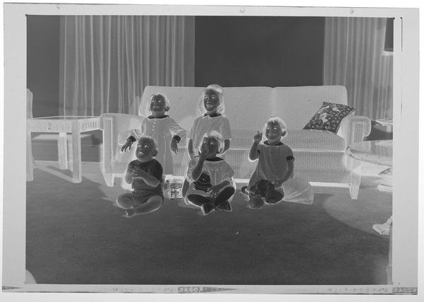 This photograph from 1955, titled "Untitled (Women with paper bags over heads)" by an anonymous artist, presents a tableau of figures cloaked in ambiguity. The composition is immediately striking: a group of individuals, seemingly women, are positioned indoors, their faces obscured by paper bags adorned with rudimentary facial features. This act of concealment destabilizes our expectations, disrupting fixed notions of identity and representation. The stark contrast between the domestic setting, with its patterned curtains and furnishings, and the unsettling anonymity of the figures creates a visual tension. The bags, as masks, function as signs, inviting us to question the social codes and power structures that might necessitate such obfuscation. The artist challenges conventional modes of seeing and understanding, revealing that the meaning of an image resides not only in what is visible but also in what is concealed. This visual game compels us to confront the complexities of representation and the elusive nature of truth within the photographic medium.