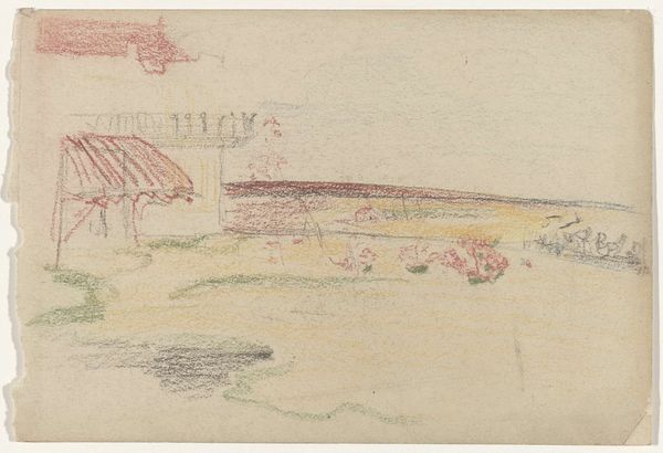 Editor: This is Jean-François Millet's pencil drawing "Vosges," from around 1867. It's a quick sketch, almost dreamlike. I’m struck by the way the building sits so humbly within the landscape, and I was wondering how you interpret this work, with its apparent simplicity. Curator: It’s precisely that humility, that deliberate positioning within a specific social and environmental context that I find compelling. Millet was deeply concerned with the plight of rural communities, with the peasant experience in mid-19th century France. So the placement isn't accidental. It begs the questions: who are the inhabitants? How is their existence intertwined with this environment? This wasn't just a pretty landscape to Millet, you see. It’s a space of labor, a space of being for a community often overlooked and marginalized by urban, bourgeois society. How do you think Millet’s style—the rapid strokes and unpolished feel—contributes to this understanding? Editor: I see what you mean. It’s like he’s emphasizing the raw, unvarnished truth of their lives. The roughness of the drawing echoes the roughness of rural existence. It avoids idealization, I think. Curator: Exactly. And in doing so, Millet subtly challenges the dominant artistic conventions that favored romanticized or idealized depictions of nature and rural life. He’s using the landscape, and his representation of it, to make a statement about class, labor, and the often-unequal relationship between humans and the land. The inclusion of handwriting is very relevant. The social history inscribed inside the landscape. The words of working people given new weight and a permanent medium. Editor: So it's more than just a landscape. It's a commentary on society. It really makes you consider the hidden narratives within seemingly simple scenes. Thanks for highlighting that! Curator: Indeed. Considering those narratives is our responsibility when we contemplate these images today. Thanks for seeing that as well!