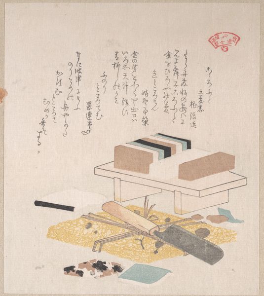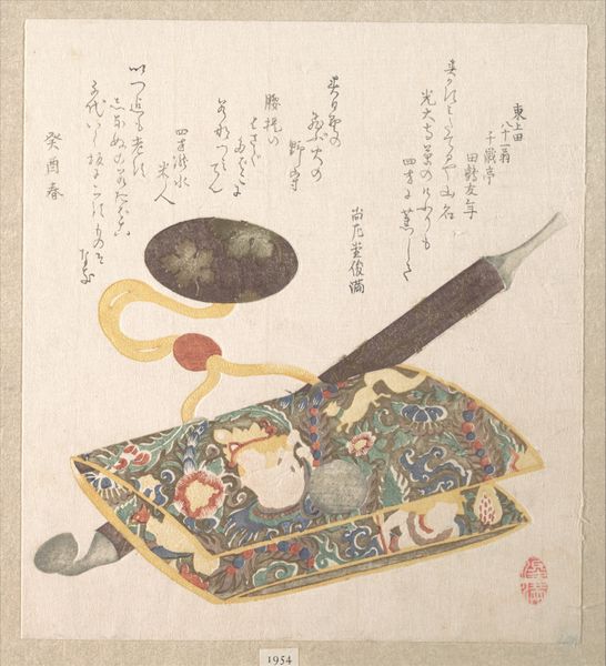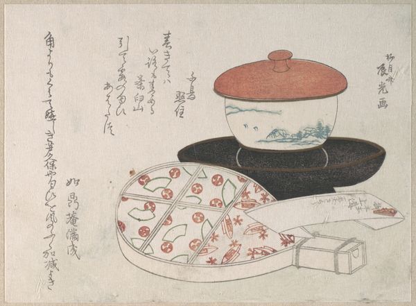 Curator: This woodblock print, “Cakes and Food Made of Seaweed,” by Kubo Shunman, dating back to the 19th century, presents a fascinating interplay between art, commerce, and culinary culture. The work is intriguing, a still life featuring boxes and a bowl containing, presumably, seaweed-based foods. What do you notice about the ways materials shape our understanding of this piece? Editor: It strikes me as a really beautiful, delicate advertisement. The presentation of the seaweed "cakes" is so meticulous; it elevates something everyday into something special. Are we supposed to admire it or buy it, or is that even a meaningful distinction here? Curator: Precisely. Shunman blurs the lines between art and advertisement, and challenges our conventional understanding of "high" art. Note the aged paper, the delicate application of watercolor in the printmaking process; consider the skill involved in producing these prints en masse. Doesn’t the labor and the materials themselves contribute to the overall meaning? Is the artistic value inseparable from the commodification of food? Editor: I hadn't considered the sheer labor involved in creating each print, especially compared to, say, painting just one canvas. So the "value" isn't just in the artistry, but also the process of production, how many were made and sold, and by whom. Curator: Exactly! The repetitive act of printing, the economic transaction implied by the subject matter, all become integral to the work’s significance. We can also ponder the social context, too. Editor: It’s interesting how understanding the materiality and means of production opens up so many questions about the work's value and cultural place. It’s much more than just a pretty picture of food. Curator: Yes, shifting the focus to the physical aspects, from seaweed to pigment, prompts us to think about how value is constructed around objects, labor, and even our consumption habits.