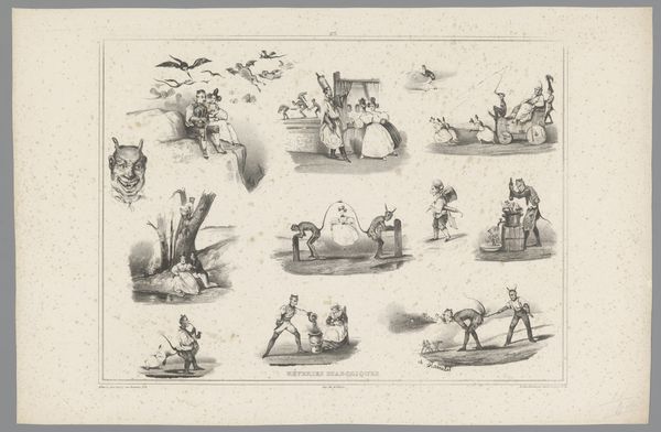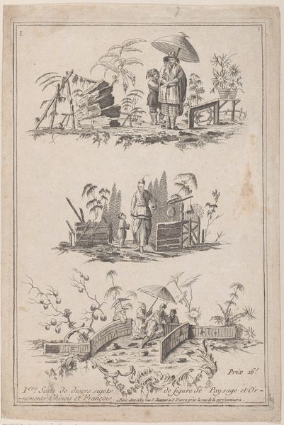 Curator: We're looking at Jean Pillement's "Chinoiserie Ornaments", an etching created sometime between 1755 and 1790. The work consists of a series of vignettes, each depicting scenes inspired by Chinese motifs. Editor: Oh, it’s like a page torn from someone's fanciful travel journal! There's a dreamy, almost cartoonish quality. The fine lines seem to dance on the page like excited whispers. Curator: That's quite fitting! Pillement was extremely influential in spreading the Chinoiserie style, a European interpretation of Chinese and East Asian artistic traditions that became popular during the 18th century. This sheet could've been used by artisans for inspiration, sparking trends in interior decoration, ceramics, and furniture. Editor: Absolutely! You can imagine these delicate drawings inspiring a porcelain painter's hand or appearing on wallpaper in some grand estate. I'm quite tickled by the fellow with a spear mid-throw at a swooping bird— so whimsical! And yet there's a certain order here, a carefully constructed reality. Curator: These “ornaments” were explicitly designed to cater to the European imagination of the “exotic” Orient. We should note that it offered a perspective of China based more on fantasy than reality. In his landscapes, you can recognize this "genre-painting" tradition, as it shows figures involved in their everyday lives within detailed, but imagined scenery. Editor: Which brings a bittersweet note to this beautiful artwork, doesn't it? The art and fashion world took so much inspiration from other cultures and places in the world! This print becomes more meaningful, and somehow a bit darker, when you acknowledge it as both something delicate and problematic. Curator: Indeed, this etching offers an invaluable opportunity to engage critically with the history of Orientalism, and understand how art both shapes and is shaped by cultural and political forces. Editor: So true, even in its playful fancies. All this thinking makes my hand twitch and imagine if this was a coloring book—maybe I'll make my own take, responding to Pillement centuries later!