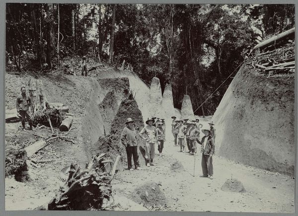 Editor: We are looking at "Aanleg van de weg langs een helling van de Woih ni Tanggo Besi," a photograph taken between 1903 and 1913 by an anonymous artist. The scene is...stark. The geometric precision of those sculpted hills contrasts so strongly with the disordered tools in the foreground. What can you tell us about how this is constructed? Curator: Certainly. If we observe the composition carefully, note how the photograph is essentially divided into layers: the foreground's tools, seemingly discarded and haphazard; the midground populated by figures alongside the strange conical hills; and finally, the barely visible top edge with traces of the forest. Editor: Yes, that layering really creates depth. How do those stark shapes contribute to the overall feel? Curator: They command our attention, don't they? Their sharp angles create a rhythm that competes with the horizontal line suggested by the road's construction. The limited tonal range – from the pale earth to near blacks – only amplifies the geometric tension inherent within the subject. Notice how light falls to highlight these cones. Editor: So, the formal elements work to create this unease. Do you see any resolution within that tension? Curator: Resolution may be too strong a word. Perhaps 'balance' is more accurate. The figures, almost an afterthought in scale, provide a human element, grounding the otherwise severe geometry. Consider what would shift within the photo's dynamic if those individuals weren't there, adding to this spatial game. Editor: That’s a really great observation, it recontextualizes the negative space between them and highlights their significance. I am starting to notice a balance now. Curator: Indeed, it demonstrates how critical looking for an artist is to build cohesion and meaning. Editor: Thanks for the helpful points on seeing visual balances. Curator: My pleasure. Remember, attentive observations unlock any artwork's structure.