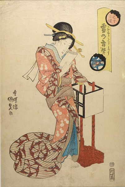Curator: Yashima Gakutei's woodblock print, "Dancing Girl Mimyo from the Mirror of the East," showcases a performer in elaborate costume. It is part of a series celebrating filial piety, but what does a dancing girl have to do with virtue? Editor: I was wondering that too! The figure seems weighed down by the garments and headdress. What's the connection to filial piety? Curator: The series connects virtuous acts to well-known figures, linking moral lessons with popular imagery. The choice of a dancer highlights the role of the entertainment industry in Edo society. The series subtly elevated the cultural status of performers. Editor: So, it's not just about the story, but about who is telling it and why? Curator: Precisely! Gakutei uses this subject matter to subtly challenge social norms, presenting performers as figures worthy of respect within the "floating world" or popular culture.