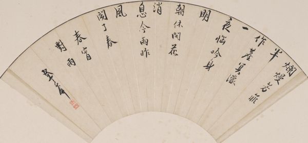 Curator: The delicacy of this fan, titled "Poem," immediately strikes me. It's such a quiet, intimate object. Editor: And an artifact, embodying the spirit of the early 18th century when Ito Togai crafted it from paper and ink. It feels almost fragile, doesn't it? Like handling a preserved breath. Curator: Absolutely. Consider the fan itself—a utilitarian object transformed into a canvas. We often overlook the inherent social dimensions, the commodification of artistry inherent in these 'everyday' items. It was surely commissioned. The creation of this Poem on a fan embodies labor and commerce, all under the umbrella of ukiyo-e practices. Editor: Exactly. The shape too - a spreading fan is a visual metaphor for expansion and opportunity. And what opportunities, what limitations were there at this intersection in early 18th century Japan, across identities, gender and race? It prompts questions around who could own such beauty, and under what conditions it was produced. It offers this intriguing duality of delicacy and constraint. Curator: It begs the question of how Itō Tōgai perceived his role in production? His choices as a materials expert of ink and paper contribute so significantly to the finished work. Did these media hold personal, political significance to him, too, beyond the sheer labor it takes to craft this? Editor: A fan in and of itself would likely be coded with social, political meanings, to communicate gendered roles and ideas of social etiquette. The artistry, in concert with that social history, elevates the function and meaning. The use of the fan as canvas prompts inquiry into the dynamics of power, and artistic agency at play here. Curator: Yes, because it isn’t only the choice of materials, but how those materials were manufactured, procured, and ultimately impacted Itō’s surrounding world that shapes the work for me. Editor: And in decoding it, perhaps we may even perceive the gentle breeze carrying this "Poem" across centuries, inviting dialogue about class, identity, and creative resilience. Curator: It is amazing how material and cultural interpretation unite here, isn't it? Together they elevate our understandings. Editor: Indeed. Every viewing is a breath of its own.
