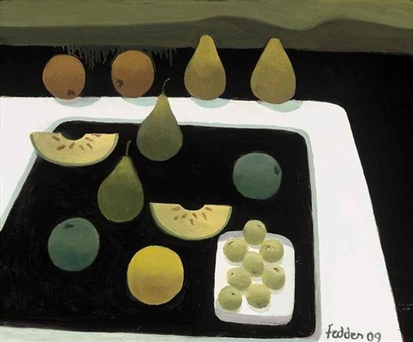 Mary Fedden made this painting of melon and grapes with oil on canvas. Look at how the forms are built up with simple, confident brushstrokes. You can see the hand of the artist, the way she fearlessly applies the paint, not worrying about perfection. There's a wonderful tension between flatness and depth here. The black background really pushes everything forward. It's like the fruit is floating right in front of us. The texture is smooth, almost velvety, and the colors are muted. The slight blending of the strokes really gives an atmospheric quality to the painting. The white plate is a beautiful abstract form in itself. The way the green of the melon is balanced against the purple grapes – it’s like a little color party. This piece reminds me a little of Giorgio Morandi's still lifes. He was a master of simplicity and quiet observation. Like Morandi, Fedden finds beauty in the everyday, elevating simple objects into something special and timeless. Art is always a conversation, right?