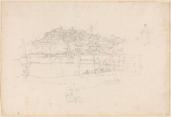 Curator: This is Denman Waldo Ross's "Landscape, Ronda, Spain," housed at the Harvard Art Museums. It is a delicate pencil drawing. Editor: There’s a certain ephemeral quality to the lines, almost as if the city is emerging from a dream. The tonality is very light. Curator: Ronda, historically, is a city cradled by mountains, a place of refuge. Ross captures this sense of the city rising above, almost floating. The high vantage point invites contemplation, suggesting the city as a symbol of endurance, a beacon of civilization. Editor: It's the composition, too. The way the city is perched so high on the page gives it a sense of monumentality, despite the delicate lines. The repetition of shapes—rectangles for buildings, curves for clouds—creates a visual rhythm. Curator: Indeed. The sparseness invites us to project our own interpretations onto the landscape, to fill in the details with our own memories and associations. Perhaps a meditation on the persistence of place. Editor: A fleeting moment, preserved through structure, like a half-remembered song.