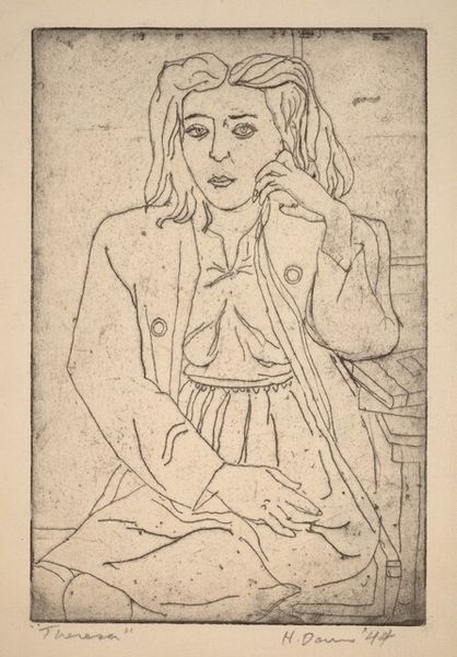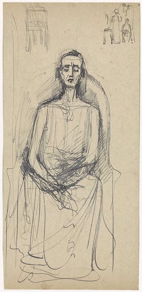 Curator: This drawing, executed in ink, is entitled “Conversation” by Erich Heckel from 1919. At first sight, it exudes a somewhat somber atmosphere, doesn’t it? Editor: Indeed, the heavy use of dark inks and sharp lines seems to invoke feelings of tension. However, the very choice of rendering figuration and intimacy is indicative of a transformative historical turn: Expressionists like Heckel actively moved to foreground individuals’ experiences and inner turmoil emerging as crucial subjects after the war. Curator: Absolutely. Consider how Heckel renders the subjects, paying careful attention to form; the elongation of facial features, in tandem with the figure's placement with hands clasped behind the head, almost seems to disfigure and evoke introspection. What purpose does that distortion serve? Editor: Perhaps the physical disfigurement is meant to mirror an emotional or societal one. After all, it was created in 1919 during a time of immense social and political unrest in Germany. Print became increasingly popular at this time, becoming a critical, accessible and portable form of artmaking used by artists. Curator: Let's unpack the medium. The work seems to oscillate between pen sketch and an etched print—the texture resembles that of both. How does it further express the internal torment within the depicted scene? Editor: By employing graphic techniques such as this, the stark contrast achieved through the marks serves to intensify the emotionality conveyed within Expressionist idioms. Furthermore, Expressionists deliberately utilized “primitive” techniques like woodcuts for printmaking in order to revive cultural traditions, while creating more relatable and authentic art for the working classes of the era. Curator: Well, seeing how both formal elements like line and figuration coincide with cultural historical moments to yield complex representations here certainly offers many layers to contemplate! Editor: Indeed, I found that reflecting upon those historical cross currents enabled deeper insight into grasping their affective states alongside his masterful usage of expressive visual form.