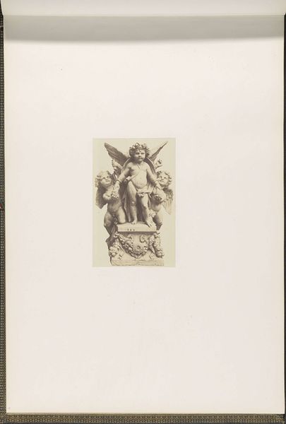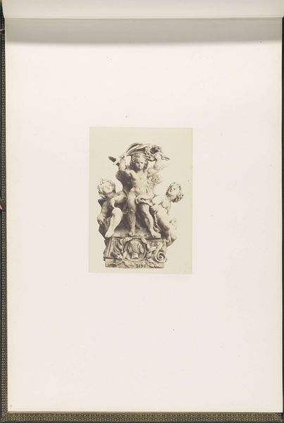 Editor: Here we have a gelatin silver print of Auguste Préault’s “Gipsmodel voor beeldhouwwerk op het Palais du Louvre: ‘Les Arts’”, dating from around 1855 to 1857. The photograph is dominated by the plaster sculpture, a cluster of figures, evoking classical motifs. What is your reading of the artwork, from a formal perspective? Curator: Note how Baldus has carefully framed the sculpture, highlighting the play of light and shadow across its surface. This emphasizes the texture and three-dimensionality of the piece, almost as much as the physical plaster. Consider how the photograph as object itself contributes. Editor: Right, the gray scale reinforces the texture. And what about the composition of the sculpture? I see this central figure seemingly held up by the others? Curator: Precisely. Consider how the arrangement – a central figure surrounded by supporting figures – establishes a hierarchical structure. This formal element reflects the classical ideals of order and balance. What effect does the mask at the bottom create in dialogue with these cherubic forms? Editor: The contrast between the dramatic, almost theatrical mask and the cherubic figures above is stark. Is it intended to inject a discordant note or reinforce themes within? Curator: A fascinating question. How do those relationships create new formal and thematic dimensions? This points towards interpreting the plaster sculpture's components and internal tensions that invite us to deconstruct meaning through semiotic means. This also highlights how Baldus, the photographer, carefully considered tonal arrangements to create contrasts. Editor: Fascinating. I had not considered the photograph as a way to reinterpret the formal ideas found within the original sculpture itself. Thanks for walking me through this. Curator: My pleasure. It is always fruitful to examine the layers of formal composition and technical expertise across multiple media, expanding our vision and creating new levels of discourse.