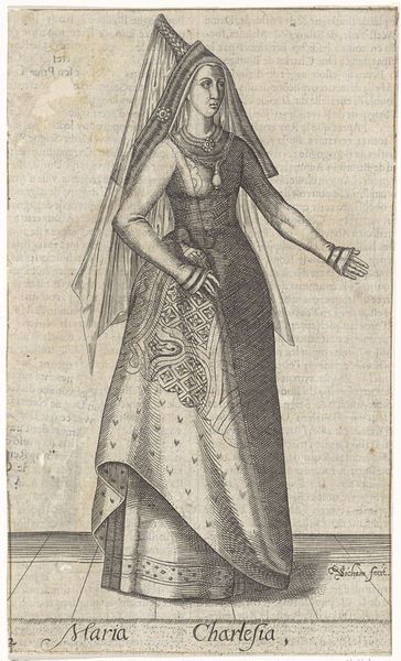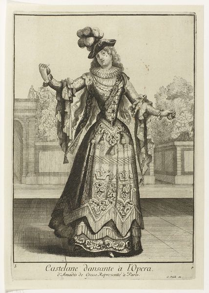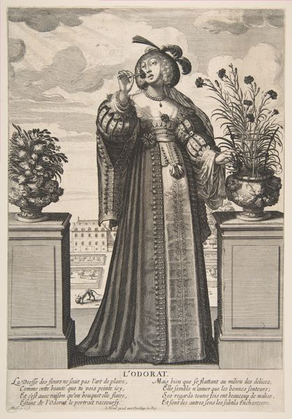 Editor: This is "Portrait of Henriëtte Amalia van Anhalt-Dessau," a print made sometime between 1724 and 1751 by an anonymous artist. The detail is incredible, almost photographic! It gives off an air of self-assuredness. What do you see in this piece? Curator: This portrait offers a fascinating glimpse into the performance of power and identity in the 18th century. Notice how the subject's elaborate gown and formal pose aren't just decorative. How might they communicate her social standing and role within the court? Editor: Well, the ornate dress certainly screams wealth, and the way she holds herself seems very deliberate, very composed. But I guess I'm missing something. Curator: Think about what it meant to be a woman of power in that era. She isn't simply representing herself; she's embodying the authority vested in her, potentially as a Regent. Does the setting play into this construction of power? Editor: It looks like she's on a terrace, perhaps overlooking her lands? The gardens, the vases… all symbols of control and dominion. Curator: Precisely. And what does it mean that this image is a print? The proliferation of her image suggests that she—or those around her—recognised the importance of disseminating her power and image far beyond the court. Editor: That's so interesting! I hadn't considered how the medium itself could contribute to the message. This portrait becomes more than just a picture; it is also propaganda. Curator: Exactly. It's a reminder that portraiture, particularly during this period, was deeply entwined with politics, gender, and the carefully constructed narratives of power. Editor: I'll definitely look at portraits differently now. Seeing them as part of a larger social and political game is incredibly enlightening!