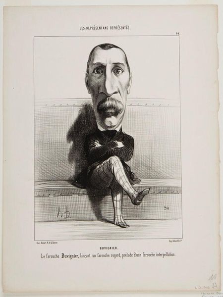 Curator: At first glance, this figure seems rather severe, almost intimidating. The artist has exaggerated his features so they are rather unsettling. Editor: Indeed. What we're looking at is Honoré Daumier's lithograph of Achille Fould. Daumier, who lived from 1808 to 1879, was a master of social and political commentary. Consider the context—France was in turmoil. Daumier used his art as a weapon, critiquing the bourgeoisie. Curator: This exaggeration, this caricature, it feels like a direct challenge to power. Daumier isn't simply depicting Fould; he's dissecting the very structures that allowed him to thrive. Editor: Precisely. And the caption: "Favorite position of this minister of finance who finds that when it comes to social improvements, there is nothing better to do than to cross your arms." It’s dripping with sarcasm. Curator: It makes you question what hasn't changed since Daumier’s time. Who still benefits from inaction? Editor: Daumier’s lithographs continue to speak volumes about power, representation, and societal responsibility.