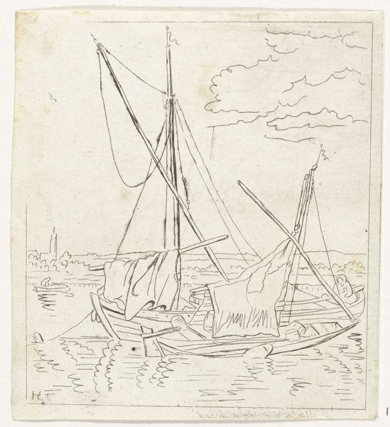 Curator: Anthonie van den Bos's "Two Sailing Ships on a River," estimated to be made between 1778 and 1838, presents us with a seemingly simple scene rendered in ink. Editor: It has such a casual, almost dreamlike quality. The lines are delicate, and the composition, though straightforward, feels very peaceful, as if time is suspended on this quiet river. Curator: These studies of boats often evoke thoughts about the great Dutch maritime history. But also it is clearly a drawing and seems to come directly from a personal sketchbook. You sense it was created with a utilitarian purpose, something quick and easy that was made for private consumption. What I notice are the faint yet defined ripples, that capture the way light interacts with the water's surface. The very prominent masts also have the appearance of something very important to record in its specific form. Editor: I find the linear nature captivating. The artist really focuses on line rather than elaborate shading to define shape and space, which directs the viewer’s eye through the artwork. There’s an undeniable emphasis on line and geometric form; you see it defining every object within the composition, simplifying reality into an assembly of these pure components. I wonder, to what extent does this focus serve as commentary on artistic priorities, or does it simply capture daily Dutch life and labor? Curator: Maybe the combination of those two aspects make this artwork appealing. These are common shapes of labor, sketched by hand, yet hinting at much larger commercial networks, but maybe also just remembering the important geometric essence that keeps a ship stable and safe. Editor: True, and I think understanding the symbolic context in art from this period allows us to see the potential multiple layers. We begin to unlock narratives around economic life and the symbolic power of line and geometric composition. Curator: Absolutely. Van den Bos offers an interesting point to discuss the relation between artistic expression, everyday life and mercantile symbolism. Editor: It has given me some points to consider for my own interpretation, thanks!