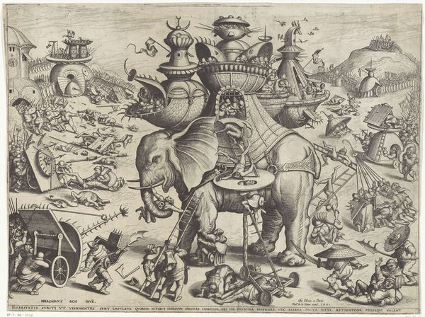 This is "The Awake Lion," an engraving made around 1615 by an anonymous artist, now held in the Rijksmuseum. The composition is divided into distinct registers, creating a layered narrative. In the foreground, a lion, the symbol of Dutch resistance, is chained yet alert, juxtaposed with symbols of oppression and conflict. Above, we see a scene of turmoil and chaos with figures being thrown into a cauldron. The engraving is densely packed with allegorical figures and scenes, rendered in meticulous detail. The contrast between the static, symbolic foreground and the dynamic, action-filled background creates a tension. This visual structure serves to highlight the complex political and religious conflicts of the time. The meticulous lines and contrasting tones emphasize the underlying instability and the struggle for liberation. The engraving functions as both a historical document and a powerful statement on Dutch identity and resistance.