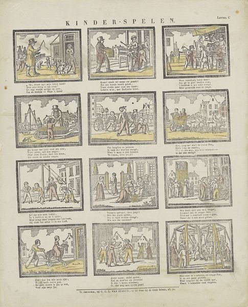 Curator: Here we have "Vertelling van den Schoorsteenveger," a print likely created between 1828 and 1937 by Oehmigke & Riemschnieder. My immediate impression is how much this piece reads like a storyboard. Editor: Yes, I see that immediately! A rather charming, if somewhat simplistic, narrative unfolds across these twelve panels, depicting a chimney sweep and the mischievous situations he finds himself in. The visual texture feels folk-loric, perhaps a tale meant for children? Curator: Structurally, it's interesting how the grid format mimics comic strips that became popularized later. Observe the somewhat crude rendering of figures, with strong outlines and minimal shading. This contributes to its accessible, almost democratic aesthetic. Editor: The central character, the chimney sweep, immediately evokes a Dickensian image – soot-covered, exploited, yet strangely enduring. His blackened skin becomes a powerful symbol of labor and marginalization. The recurring ladder acts almost as a visual motif. Curator: Note how the color palette—though limited—is used to emphasize spatial depth and hierarchy within each panel. See the limited use of red to suggest both danger and excitement, which in a semiotic context heightens narrative tension. Editor: The children surrounding him seem intent on causing chaos at every turn! Symbolically, they embody disruption. What narrative thread is drawn between innocence, exploitation, and social disruption in the Dutch context of its creation? Curator: The repetition of the chimney sweep, and certain structural elements within each framed composition creates a certain type of meaning... I agree; they underscore the repetitive nature of his labor, a grim, but crucial part of the developing industrial world at this time. Editor: It's an ambiguous piece, isn't it? We are presented with some scenes that represent harm. How do these symbols weave through the comic, both warning and potentially endorsing specific roles or beliefs? Curator: From a purely formal perspective, the use of line, color and the arrangement of these individual, paneled frames come together. I find these panels fascinating to break down into compositional techniques. Editor: Indeed! A glimpse into social anxieties. We can see how people created images and told stories through a dark lens!