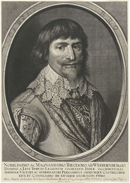 Curator: Looking at this print, “Portret van Christiaan van Denemarken en Noorwegen,” created in 1643 by Albert Haelwegh, I’m struck by how symbols of power are meticulously rendered here. Editor: It's a portrait steeped in authority, isn’t it? But honestly, what catches my eye immediately is the very tactile nature of the rendering; the graphite lines that convey the king’s presence and finery…it’s an alluring act of material translation. Curator: Absolutely, there's a careful orchestration of visual elements. Think of the lace collar – a signifier of status, of course – and the grand feathered hat adorned with a jewel. These emblems elevate the King but also serve as reflections of Denmark and Norway. Editor: And consider the economic structures behind these garments—the skilled artisans, the trade routes providing the materials. These are the building blocks of this constructed image of sovereignty and authority! What material processes shaped it? And who profited from its circulation? Curator: The formal setting creates an important visual language for us. Consider the gaze: it suggests confidence, power, even perhaps a sense of divine right. Notice, too, how the oval frame lends a sense of history and the weight of ancestral lines to this man. Editor: Frames matter, visually and materially: think about where the paper came from. Did this exist as one of many impressions that bolstered the state's power by sheer multiplication of the image? The lines, after all, are repeatable, distributable…part of a nascent image-based propaganda machine! Curator: The historical weight is fascinating, given the political currents swirling during that time in the Northern Seas. What meaning would this image of stability hold for viewers then? Editor: For me, reflecting on this print has really highlighted the labour invested, making tangible power in this single object – a reminder that even monarchs depend on earthly and material creation for image, legacy, and legitimacy. Curator: And I find myself contemplating the enduring capacity of portraits, even through something as simple as graphite, to communicate deeply ingrained ideas about leadership. Editor: It’s a study in contrasts. On the one hand, it's the king and the kingdom, yet there’s the labor to consider—craft, paper, ink, tools, that makes representation possible at all. Fascinating.