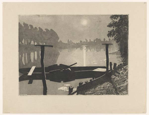 Editor: This etching, "Moonlight on a Lake Surrounded by Trees" by Herman Boulenger, dates back to 1893. The monochrome palette gives it such a subdued, almost dreamlike quality. What strikes you most when you look at it? Curator: What strikes me is how a seemingly tranquil scene engages with a larger cultural discourse. The late 19th century saw the rise of Symbolism, a movement reacting against industrialization. Did artists at the time look back to simpler times for their subject matter? Or perhaps, does it represent something else? Editor: That's interesting. I hadn’t considered the Symbolist connection. Maybe it represents a kind of spiritual longing? Curator: Precisely! Consider how the image avoids overtly political themes, instead finding solace in nature. The moon, a recurring symbol in art, represents cycles, mysteries, and the sublime, but why focus on this particular aspect of life, at a time of great social upheaval? Editor: I suppose the focus on inner experience offers a different form of resistance. Was the market for such art driven by any specific factors? Curator: Good question. The burgeoning middle class, with its aspirations for cultural capital, created a demand for art that offered emotional resonance rather than political radicalism. Did it become a refuge of sorts? Editor: It's fascinating how the art world responded to the political environment back then. I never thought about it that way before. Curator: Exactly! Context enriches our understanding of even the simplest landscapes. Understanding social forces shapes our perception and deepens our connection. Editor: Thank you so much. That really reframes my understanding of this artist and work!