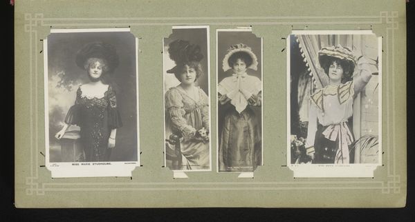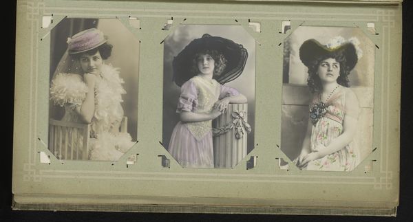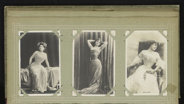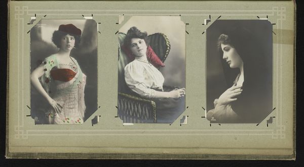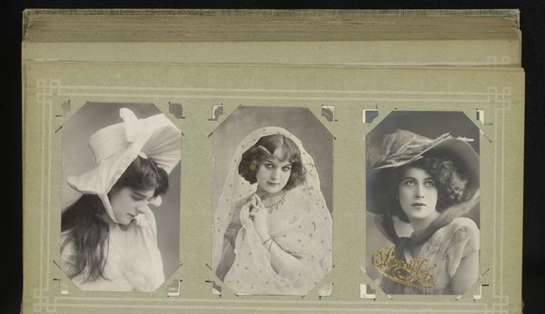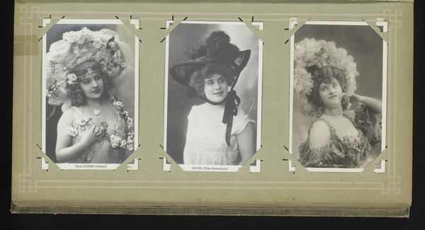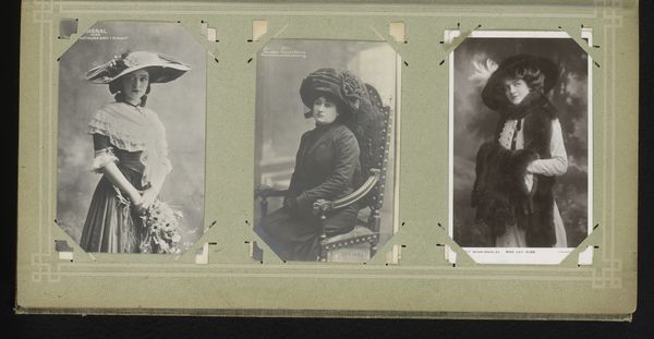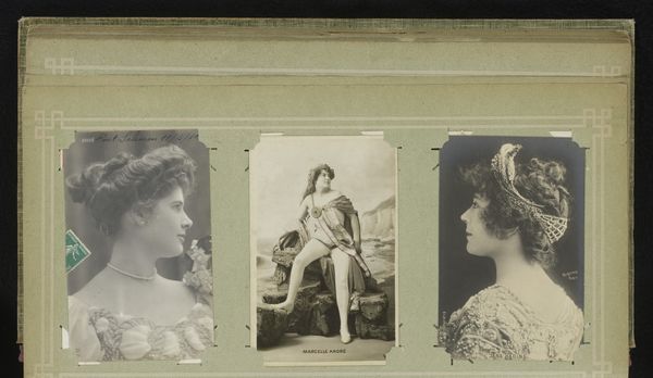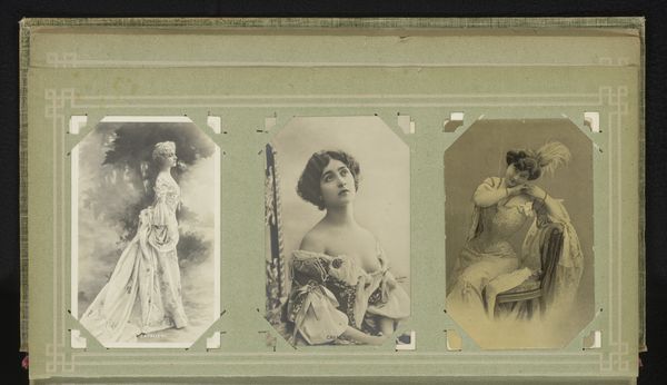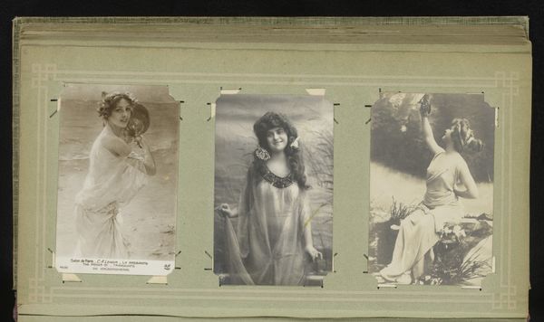 Editor: So, this is a gelatin silver print, titled *Three Portraits of Women, including Maria Marville*, by Ch. Reutlinger, made sometime between 1900 and 1930. I find it striking how intimate and almost wistful the portraits feel, especially with that soft focus. What catches your eye when you look at this piece? Curator: You know, it's funny, but my gaze is drawn to the props and costumes – the gate, the furs, even the flowers – little stages they built for themselves. Each woman seems to be performing a version of femininity, a dance between the public and the private self. Does that resonate with you? Editor: I see what you mean! It’s like they are presenting an ideal… were these popular conventions for portraits at the time? Curator: Absolutely! Think about pictorialism, the art of making photographs resemble paintings or drawings. This aesthetic allowed people to express their creativity, to give more than just information; their individual impressions. And the choice of a gelatin silver print allowed a soft, painterly effect, heightening this impression. Don’t you agree? Editor: It does make it look like something in between painting and reality, as though in a dream… Curator: Exactly! It's fascinating to think about what they were trying to capture and convey beyond just their likeness. It makes you wonder about their personal narratives too, doesn't it? What were their hopes, what were their loves? What did their laughter sound like? Editor: Absolutely, it almost makes me want to write stories about them. This was really enlightening; it has deepened my appreciation for these women and the artistry behind capturing their likeness in such a painterly manner. Curator: Same here. It’s easy to dismiss them as just “old photos,” but there are entire universes waiting to be discovered!