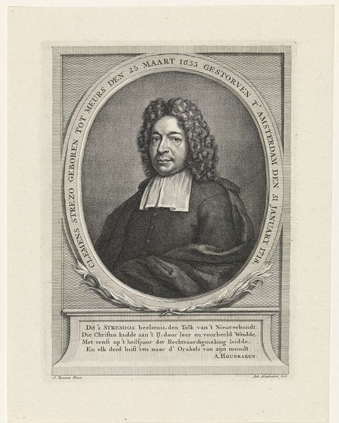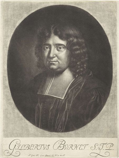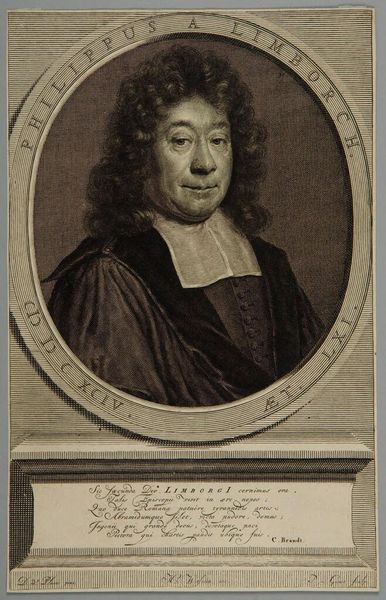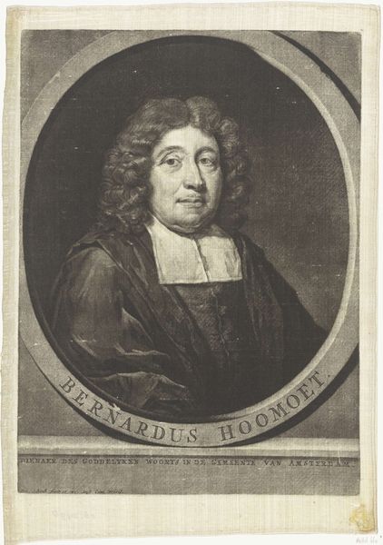 This portrait of Adriaan van Oostrum was created by an anonymous artist using the intaglio printmaking technique known as mezzotint. This process involves roughening the entire copper plate with a tool called a rocker, creating a surface that, if printed, would produce a solid black area. The printmaker then smooths certain areas of the plate with a burnisher and scraper, creating lighter tones in the image. The resulting print has a velvety texture and rich tonal range, evident in the soft gradations of light and shadow that define van Oostrum's features and clothing. The mezzotint technique allowed for the reproduction of fine details, such as the intricate curls of the sitter’s wig, and the delicate lines of the inscription below the portrait. Mezzotint was a popular method for reproducing portraits in the 17th and 18th centuries, as it allowed for relatively large editions to be printed. The production of prints like these, involved the labor of skilled artisans, contributing to a growing print market and wider dissemination of images. By considering the material and the making, we can gain a deeper appreciation for its cultural significance.