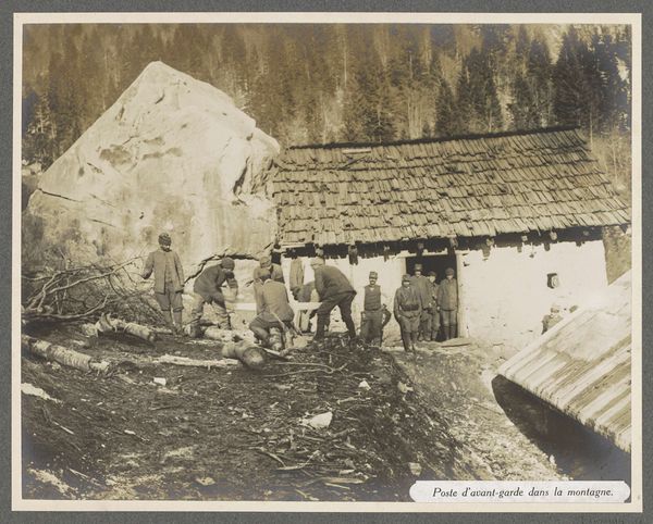 Editor: This photograph, “Militairen bij loopgraven in de frontlinie, vermoedelijk Italianen,” taken around 1916, shows soldiers in what looks like a very rough, mountainous terrain. It's a gelatin silver print, giving it a stark, documentary feel. The landscape dominates, almost swallowing the figures. What's your take on this image? Curator: Looking at this, I immediately think about the materiality of war. Consider the immense effort to construct those trenches in such a difficult landscape. The timber, the earth moved – it’s all human labor transforming the environment. How does the print itself, the gelatin silver, play into the dissemination and consumption of this war imagery? Editor: That’s a good point. The reproduction of images, how they circulated… it’s easy to overlook. Curator: Exactly. And look at the clothing and equipment the soldiers are carrying. Everything about their uniform speaks to material deprivation and preparation for a brutal physical undertaking. Were these materials locally sourced? Imported? How did the war effort impact the economies of those areas? Editor: So, you see this photo as a document of material conditions and the massive logistical effort behind the conflict? Curator: Precisely. The “war” is more than just strategy and politics; it is the immense exertion of men extracting and constructing. What do these stark huts suggest about how and from what these men made their shelter? Are they resourceful? Were they made from the earth around them? This makes me consider the social structure of this specific conflict. Editor: That reframes it for me. I was focused on the representation of war, but the material reality is far more revealing. Curator: Indeed. The availability, deployment, and consumption of goods ultimately reveals the inner workings of war in a profound and lasting way.