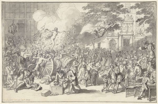 Romeyn de Hooghe made this print, Fireworks in the Palace Garden, in 1686 using etching and engraving techniques. The effect depends entirely on the artist's skill with line. Look closely, and you'll see that he created a complex visual language using only the contrast between black marks and white paper. De Hooghe was a master of this kind of printmaking, which allowed for the relatively quick reproduction of images. The print celebrates an event, and also advertises the power of the person being celebrated. In other words, it’s propaganda. The combination of artistry and social messaging gives the print a unique power, placing it between the traditions of craft and fine art. And think about all the labor involved: not just De Hooghe's, but the artisans who set up the fireworks display, and those who built the palace in the background! All of these efforts speak to a society structured around displays of wealth and authority.