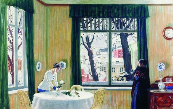 Boris Kustodiev made this portrait of M.V. Dobuzhinsky at the table with oil paint, though when is a bit of a mystery. Look at how the room almost vibrates with a bright, aquamarine energy. It’s like Kustodiev is setting the stage for something dramatic. The paint is applied so directly, you can almost feel the bristles of the brush dancing across the canvas. I love how he doesn't try to hide the process. The brushstrokes around the mirrors and the little figurines on the wall are so alive, they could almost be characters in a play. The surface is tactile, alive. It’s not about perfection; it’s about feeling. Notice the way he renders the food on the table – it’s almost abstract, a playful collection of shapes and colours rather than a realistic still life. It’s like he’s saying, "Let’s not take ourselves too seriously." Kustodiev's work has a kinship with the raw expressiveness of someone like Paula Modersohn-Becker, they both seem to share an interest in emotional expression, prioritising the visceral quality of paint over the illusion of reality. Ultimately, this painting reminds me that art is a conversation, an ongoing experiment, and not some rigid, fixed thing.
