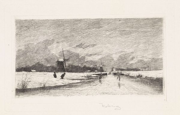 Willem Steelink created this winter landscape using etching, a printmaking technique that allows for finely detailed monochrome images. The plate would have been covered with a waxy ground, and then scratched into with a sharp needle, exposing the metal underneath. Immersed in acid, the exposed lines would bite into the metal. This process dictates the print's appearance, with the etched lines creating texture and tone, from the snowy ground to the distant windmills. Steelink employed the skills involved in etching, and these would have been honed through traditional art training. Yet the print also captures a scene of everyday life: a figure trudging along a towpath, boats laden with cargo, and windmills that speak to the industrialization of the Dutch landscape. By focusing on the materials and making of this winter scene, we can appreciate how artists like Steelink blurred the boundaries between fine art and the representation of ordinary life.