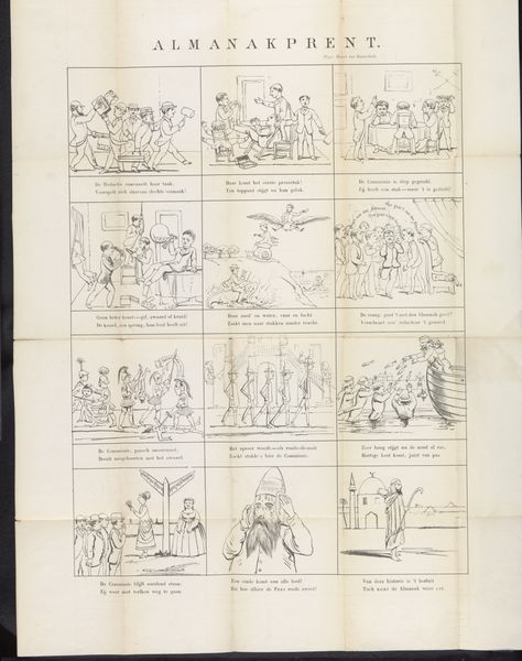 Editor: This is "Albumblad met diverse voorstellingen," a page from Alexander Cranendoncq's sketchbook, made with ink on paper between 1814 and 1869. The scenes seem to depict various historical and military events. It has an unfinished, almost frenetic quality. What stands out to you? Curator: Well, I’m drawn to consider the materiality of this "Albumblad." We must recognize paper, ink, the very act of drawing as labor. It seems these materials aren’t simply neutral tools but actively shape the representations we see. What do these repeated scenes of conflict tell us about the paper, about Cranendoncq's practice of reproduction of labor, of consumption? Editor: That’s interesting. So you see the materials and process as central to understanding the work’s meaning, rather than focusing on the historical narratives it might be illustrating? Curator: Precisely. Consider the implications of this being in a sketchbook, implying repetitive actions. What type of labour is reproduced? Also the drawing style itself – the rapid lines, the apparent lack of refinement - how does that influence our interpretation of historical depictions? It does raise the question, in what context where those sketches circulating and influencing a wider public? Editor: So it's less about "what" is being depicted and more about "how" it was made and what those choices signify about the artist's relationship to his materials and, maybe, to historical events as commodity? Curator: Exactly. It reframes our understanding. The album isn't simply a record of historical moments, but the very labor it took and materials used reflects economic and historical modes. What this piece reveal about consumer habits during its time, from paper production to dissemination? Editor: I never thought about a drawing like this. I usually look to recognize symbols, and imagine cultural circumstances. This emphasis on materials gives me something concrete to look at. Thank you for a new angle.