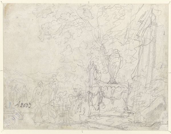Johannes Tavenraat made this landscape sketch with pen in the Netherlands during the 19th century, a period marked by significant shifts in Dutch society and art. The sketch, while seemingly simple, reflects the changing relationship between humans and nature amidst increasing industrialization. Tavenraat's choice of a minimalist style invites us to reflect on the emotional and psychological impact of the environment. How does the artist's perspective shape our understanding of the landscape? How does it reflect the lived experiences of individuals navigating a rapidly changing world? The artist's attention to the subtle details of the landscape can be seen as a commentary on the importance of preserving and appreciating the natural world. It captures a moment of quiet contemplation, inviting viewers to consider their own connection to the environment.