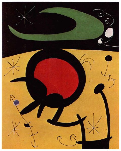 Alexander Calder made this painting, "The Fuse," in 1947 using a brush. The rusty red ground looks like it was laid down fast, setting the stage for a mix of playful, geometric shapes. It’s interesting to notice the way Calder handles the paint. In that bold black spiral, you can see how the brush almost dances across the surface, leaving a slight trail of texture, but elsewhere the paint is really thin and flat. It’s a mixed bag, which creates an atmosphere of activity. The contrast between the controlled shapes and the more haphazard background makes it feel like the painting is alive. He’s got the spirit of Miro here, but also the seeds of artists like Elizabeth Murray, who found ways of making painting into a dynamic experience that’s as much about process as it is about the final image. It's a reminder that art is always in conversation, building on what came before, and looking toward what could be.
