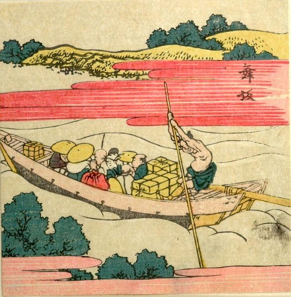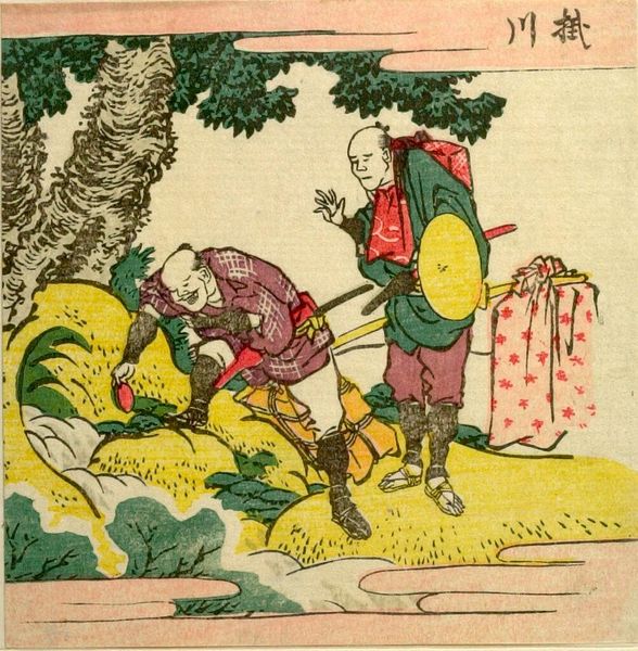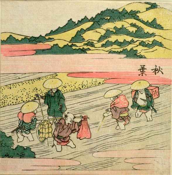Editor: This is Hokusai's "Men Traveling the Utsu no Ya Pass," a woodblock print. The travelers' heavy loads make me think about the physical realities of journeying. What stands out to you? Curator: The print highlights the material conditions of travel and trade. Notice how Hokusai depicts the porter's burden versus the attire of the seemingly wealthier travelers. It raises questions about labor, class, and consumption in Edo-period Japan, wouldn't you say? Editor: That's a fascinating point. I hadn't considered the class implications so directly. Thanks! Curator: Considering the production of the woodblock itself allows us to rethink common assumptions of fine art.