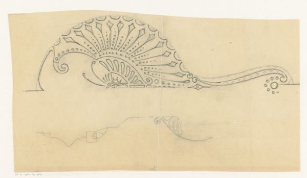 Curator: Here we have an intriguing pencil drawing titled "Ornament met zeepaardje," or "Ornament with Seahorse," created by Reinier Willem Petrus de Vries between 1884 and 1952. What’s your immediate reaction? Editor: I find it whimsical, almost like a preparatory sketch for something grander. The light pencil work gives it an airy quality, a sense of something fleeting or still in the process of becoming. Curator: It’s interesting that you mention "preparatory" as I read the image somewhat differently. Notice the line work: repetitive strokes meticulously map out the form, almost like a technical drawing of an idealized form. De Vries might be exploring geometric forms that give order to nature, here representing the seahorse as a motif that can easily adapt to surface patterning. Editor: True, there's a geometric aspect, especially in the tail composed of connected square-like forms. But, think about the socio-cultural context of seahorses. In some cultures, they are symbols of patience, contentment, and protection due to their docile nature and parental care of the male of the species, who incubates eggs in a pouch, so perhaps it’s also the artists' expression of domestic stability. Curator: That's a valid reading and it helps us decode beyond the purely aesthetic values of line, form, and composition. It could also be understood as reflecting the larger debates concerning evolution, natural selection, and our relationship with the animal world, and I do appreciate your inclusion of this interpretation. However, considering its status as a preliminary sketch, I'd caution attributing deep symbolic intent. Editor: I disagree, that would imply that design and society operate in distinct spheres, but designers participate and perpetuate certain views with their creations! We might then interpret that a 'preliminary sketch’ allows the expression of latent anxieties more candidly precisely due to the seeming lightness you appreciate so much! What is it about the sketch’s style, besides composition, that compels you? Curator: The delicate rendering evokes a kind of wistful beauty. But you are making me reconsider. Editor: Exactly, design embodies the ethos of production whether you mean the mode or form! Thank you.