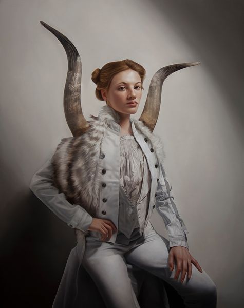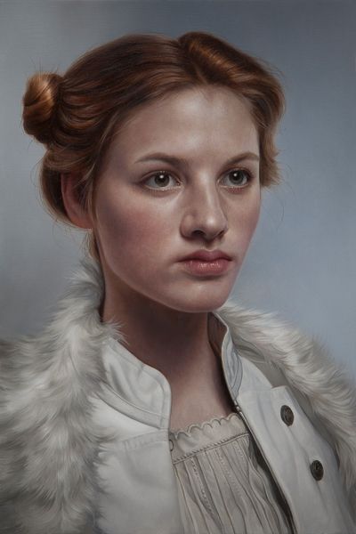 Editor: "White Harts Return II", an oil painting created in 2017 by Mary Jane Ansell... the texture achieved here is quite astounding, and there's this air of...aristocracy but almost…manufactured? What's your take on it? Curator: Manufactured aristocracy is an apt description. Consider the *stuff* here. Oil paint, carefully applied to mimic fur, skin, fabric. What does it mean to painstakingly *make* an image of luxury goods instead of simply acquiring them? It points to the labor involved, the class aspirations embedded in consumption, doesn’t it? Editor: Absolutely. I noticed how the buttons and epaulettes are subtly visible—almost as if they are mass-produced, while all the faux-fur evokes this craft element, which leads me to think: Who exactly is consuming the goods, here? Curator: Precisely. This painting becomes less about portraying a specific individual and more about the social constructs surrounding her. Think about the origin of oil paint, its availability to different socioeconomic strata throughout history. The *act* of painting luxury, of simulating these materials, speaks volumes. Editor: It almost seems critical of aspirational culture—the striving for an identity linked to material wealth. Do you think Ansell is intentionally commenting on that? Curator: It's difficult to know her precise intent. However, by focusing our attention on the materials and their representation, she compels us to consider the social and economic underpinnings of such aspirations. It shifts our gaze from the subject to the means of production and representation itself. Editor: This conversation made me look closer at how even something seemingly straightforward, like a portrait, is intertwined with complex socioeconomic meanings through material and process. Curator: And understanding that relationship reveals the hidden dialogues art can conduct with its viewers about value, labor, and class.