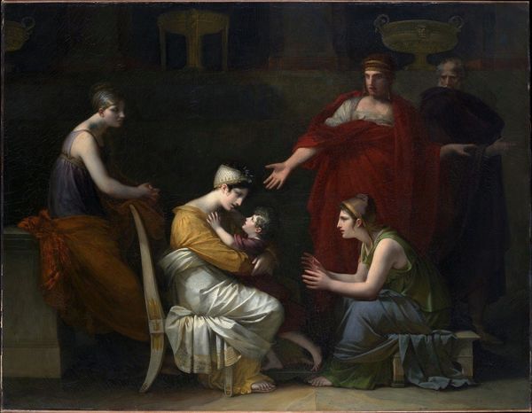 Curator: Let's explore Nikolai Ge's "Achilles and the body of Patroclus," a work dating from 1855 and currently residing in the Belarusian National Museum of Fine Arts. It's an oil painting showcasing a poignant scene from Greek mythology. Editor: My immediate impression is of intense emotion, of course. The painting exudes grief; the heavy use of shadows accentuates this mood. Curator: Indeed, and Ge positions this emotional tableau within a powerful exploration of relationships shaped by war. The painting prompts us to question patriarchal systems, and consider the often-silenced narratives of love and loyalty in hyper-masculine contexts. Think, for instance, of Achilles' profound mourning and rage driving him. Editor: The arrangement of figures struck me. The lifeless body of Patroclus horizontally juxtaposed with the anguished, leaning form of Achilles above it generates a dynamic contrast. I note how the artist plays with light and dark to isolate Achilles' face, almost inviting a focus on individual emotion versus collective despair. Curator: Ge certainly draws attention to Achilles, not merely as a warrior, but as a man deeply affected by loss, his power seemingly dissolving in the face of vulnerability. Further, we could unpack how classical portrayals often sidelined such tender representations of male intimacy in art, hinting at themes of queer desire often left unspoken in heroic narratives. Editor: What is interesting in how Ge is handling the light! Patroclus’ pale skin seems luminous, which could symbolize the loss of life and maybe immortality or at least an entry into the stories we tell about heroes and legends.. And that harsh lighting isolates figures to amplify the overall dramatic effect, it also creates an amazing set of triangles if you trace the outlines of figures and garments! Curator: And what does it suggest about power when the legendary Achilles is displayed, not in battle, but in mourning, defying our common, classical expectations of heroism? Ultimately, Ge provokes us to re-examine the multifaceted stories of men, especially concerning love and warfare within broader socio-political frameworks. Editor: Yes, the geometric relationships help intensify the moment by unifying or dividing, and reinforcing visual reading patterns but as we considered context the image tells the classical myth in ways the eye both absorbs the visual details and unpack the layered emotional and politicized ones.. Thank you for giving me more insights.