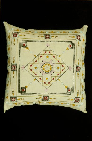 This cushion, made of white satin with orange embroidery, was crafted by Sophia Maria Frikkers-Rasen around 1898 for the wedding or inauguration of Wilhelmina. The cushion is dominated by floral and foliate motifs arranged symmetrically around a central flower. The stylized flower speaks to the enduring human fascination with nature's beauty, a symbol found across epochs. Similar floral designs appear in ancient Minoan frescoes, adorning palaces and pottery, and echo through the Renaissance in Botticelli's "Primavera," where Flora scatters blossoms as a symbol of renewal. The human psyche seems to be deeply rooted to floral motifs for regeneration and growth. Consider how the central flower motif, once a sacred symbol of life and fertility in antiquity, evolved into a decorative element, subtly conveying wishes for prosperity and continuity of the royal line. This cushion is a rich tapestry of cultural memory where threads of history intertwine.