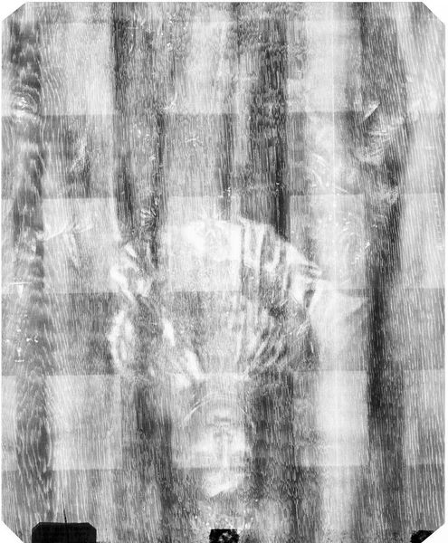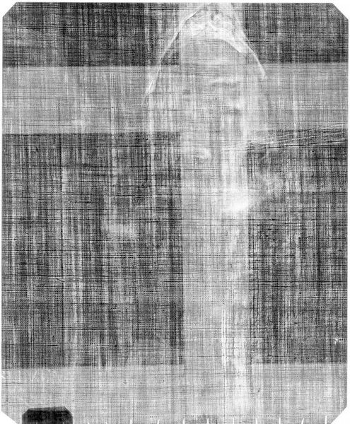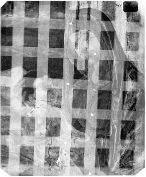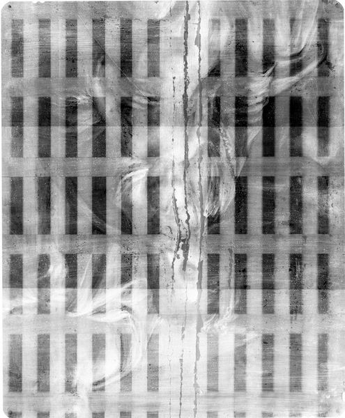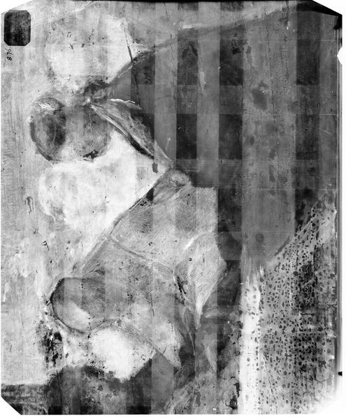 Editor: This is an X-radiograph of "Flight into Egypt" by Adriaen Isenbrant. The image is ghostly, with a grid obscuring what I think are figures. What can we learn from this unusual perspective? Curator: It reveals how art and science intersect, offering insight into artistic processes. The X-ray unveils the underpainting, challenging the completed image and raising questions about the artist's intentions versus what's visible to the public eye. It prompts us to consider the layers of meaning embedded within the artwork and who gets to see them. Editor: That's fascinating, I never thought about how much an X-ray could reveal about the layers of meaning. Curator: Precisely. It encourages a dialogue about authenticity and the power dynamics inherent in art historical analysis.