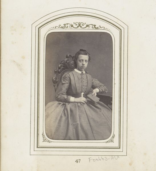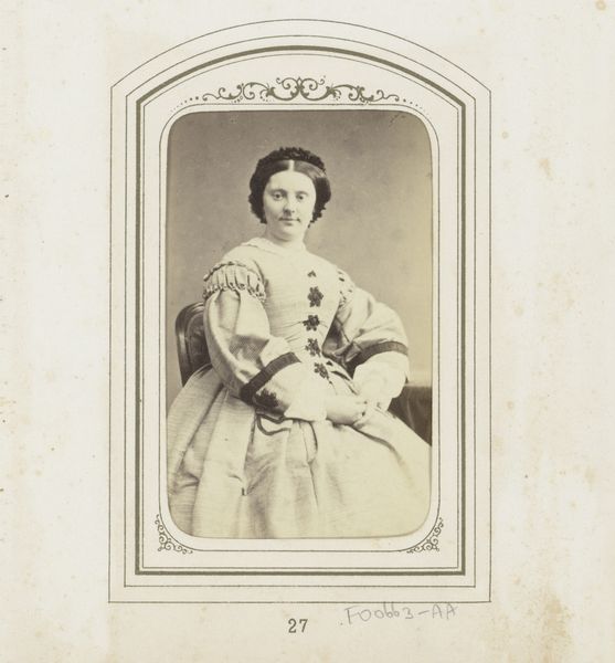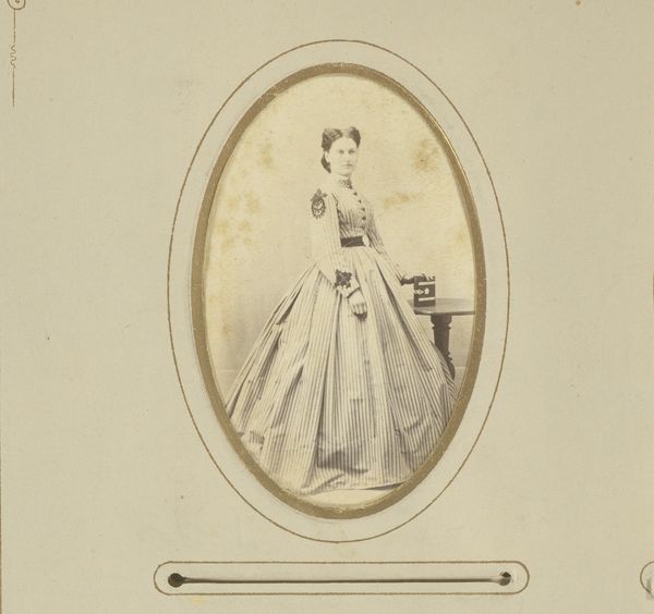 Curator: Here we see a "Portret van een staande vrouw met hoed," or "Portrait of a Standing Woman with Hat," created sometime between 1860 and 1870 by Lambertus Martinus Delboy, crafted with photomontage techniques. It’s quite striking. Editor: The composition feels rather stiff to me. A frontal, almost symmetrical pose, dominated by the texture of that extravagant lace, and the light…well, it flattens everything. Curator: Ah, but that perceived "stiffness" is itself symbolic! In the Victorian era, formal portraiture signified respectability and status. The elaborate attire whispers volumes about her place in society and this medium grants accessibility that painting couldn’t provide for some at the time. Editor: Agreed. But I can't ignore how the dress nearly swallows her! All of this volume below compared with the rather restrained presentation of the head, it nearly becomes another form entirely. Curator: Note the hat, however. It's deliberately held, drawing our eye. A hat, more than mere fashion, often denoted societal role and marital status. The portrait hints at social aspirations, capturing not just an image but an identity being carefully constructed. Editor: Perhaps. But is this ‘construction’ the intent of the sitter, or imposed by Delboy's aesthetic? Even within the somewhat limiting structure of the time, one can imagine a dynamic pose, a more assertive interplay of shadow and light, disrupting this controlled composure. Curator: Think about how the photographic portrait, during this time, was a democratization of sorts. Suddenly, those without the wealth to commission paintings could still have their likeness preserved. This itself speaks to a society undergoing change. Editor: A visual code, then, layered into the sepia tones. I remain struck by how much these portraits, even while aspiring to capture something timeless, so distinctly ‘date’ themselves, and us along with it. Curator: Precisely, time does impact and influence even photographic art. Thanks for offering that nuanced perspective. Editor: My pleasure. It helps to try seeing both what is visible and what those images deliberately hide.