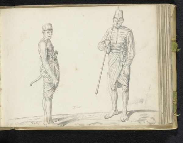 Curator: This pencil and ink sketch on paper is titled "Two Sinhalese Soldiers," created in 1662 by Esaias Boursse. What's your initial take? Editor: Stark. It feels immediate and a little haunting, perhaps due to the stark contrast and the paper’s age. The figures seem to be waiting, posed. Curator: Indeed. Boursse, a Dutch Golden Age artist, likely made this drawing in situ during his travels. Think about the materiality here. It's a readily transportable sketchbook drawing. He wasn't creating a finished history painting; instead he created a record—of labor, power and observation on Dutch Colonial activity. Editor: Right. The swords each man carries certainly signal power and readiness. But to me they appear weary or resigned. Note how the artist used tonal shifts to convey skin color, attire and swords as symbolic carriers of identity. It communicates far beyond the mere ethnographic documentation. Curator: It's interesting to consider what Boursse's access was. These figures seem, based on dress and accoutrements, positioned somewhere within the military structures enacted in then colonial Ceylon. Did they sit for him willingly? Were they conscripted labor? These factors change how we understand the finished work and its legacy. Editor: A valid point. How does the setting affect its reading? They are placed upon what seems like a dock, possibly overseeing laborers; such symbolic domination seems implied. I find it really fascinating to think of it now as we see the image—it takes on an afterlife it could not have initially held. Curator: Absolutely. That sketch-like quality allows the cultural nuances to rise to the fore, forcing a reflection upon what labour and resources were required in creating the physical items each man wears or uses. The means of production, consumption, and display all intersect in this work. Editor: By observing how an artist of that time represented cultural markers—those swords, for example—we gain invaluable insights into societal values and the psychological implications of cultural exchange. I am very drawn to their composure and clothing. Curator: Ultimately, the work presents to modern eyes many avenues to reflect critically. Boursse provides us not just an image, but evidence. Editor: Yes, that tension between observed 'reality' and symbolic presentation makes this humble sketchbook image remarkably resonant.