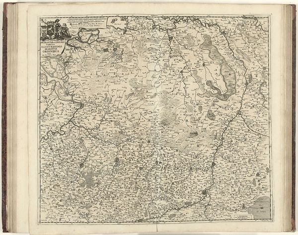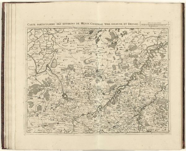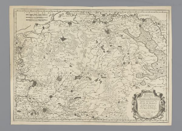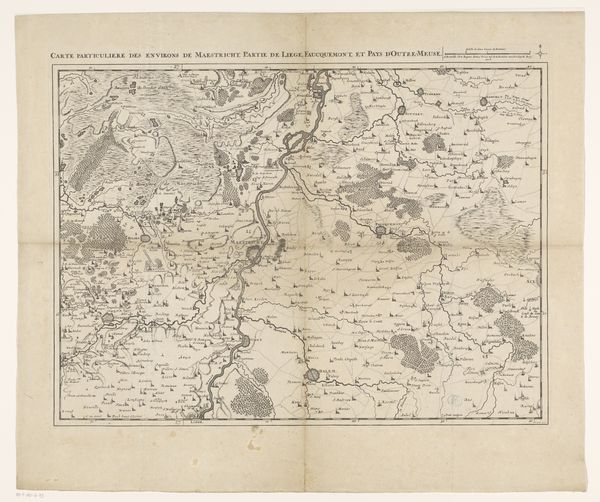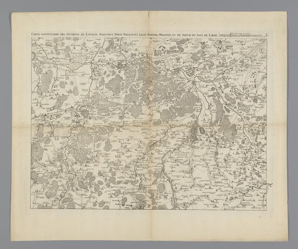 Editor: Here we have Jacobus Harrewijn's "Kaart van het gebied ten westen van Brussel," created between 1708 and 1712, a detailed engraving. It's really striking how the landscape is meticulously laid out, yet it feels more like an artistic rendering than a strictly accurate map. What do you see in this piece? Curator: This map offers a glimpse into the power dynamics of the early 18th century. It's not just a representation of geography, but also a statement of control and ownership. Think about the intended audience—likely wealthy landowners or military strategists. How does the map serve their interests? Editor: I guess it gives them a bird’s eye view of their domains, potentially for strategic planning. Curator: Precisely. Consider the Bois de Soigne—it's prominently featured. What might that forest have represented in terms of resources, hunting rights, or even symbolic power for those who controlled it? Also notice how "Brussels" is at the heart of this mapped-out region. Who benefitted from this type of representation? How is land ownership represented or visualized? Editor: It sounds like this map wasn’t just about wayfinding, it was about visualizing and solidifying power. Do you think the detail is about trying to make this seem scientific? Curator: In a way, yes. The very act of mapping, of imposing order onto a landscape, reflects a certain worldview. It subtly asserts dominance by defining boundaries and resources within a colonial frame. What social narratives are embedded in this bird's-eye perspective? Editor: I see what you mean! I never really considered maps as having their own narratives. It’s about claiming space through art and science combined. Curator: Exactly. By deconstructing these seemingly objective representations, we can uncover the cultural and political values embedded within them. Maps aren't neutral. I'm glad we've come to understand the context and politics behind this cartographic representation together.