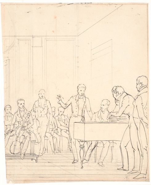 Editor: This drawing, "Das Gutachten_ Sieben Herren, ein Gemälde betrachtend," attributed to Friedrich Moosbrugger, depicts seven men gathered, seemingly critiquing a painting. The sketch-like quality gives it a sense of immediacy. I'm curious about what they might be saying or thinking. What do you see in this piece, beyond just a group of men looking at art? Curator: What strikes me is the power dynamic at play. Who are these men? Their attire and bearing suggest a certain level of social standing, perhaps academics or patrons. Their gaze, their gestures – they’re actively judging, participating in a form of cultural gatekeeping. And where are the women? This image is powerfully evocative of a very specific and exclusive intellectual sphere. Editor: That’s a good point. The absence of women is noticeable now that you mention it. So, is the act of appraising art, as shown here, a statement about power itself? Curator: Precisely. Consider the historical context: Who had the authority to define taste, to deem what was worthy of attention and what wasn't? Often, it was this circle of men, reinforcing existing social hierarchies and, by extension, aesthetic norms. How do you think this image would be perceived differently if it included women? Or people of color? Editor: That really flips the perspective! If women or people of color were present, the narrative shifts from a closed circle of judgment to, maybe, a challenge to that established power. It's almost confrontational, which, obviously, this drawing is not. Curator: Exactly! It prompts us to reflect on the mechanisms that shape artistic canons, and to question who is included – and excluded – from those defining narratives. Editor: I didn't expect a simple drawing could spark so many ideas about the art world's power structures. Thanks for shedding light on that. Curator: Art is always about more than meets the eye.