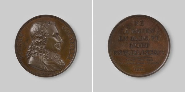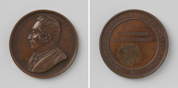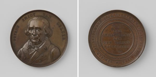 Editor: So, this bronze sculpture, "Abraham Lincoln en de afschaffing van de slavernij in Amerika 1862," made in 1865 by Hugues Bovy...it feels like more than just a portrait, more like a historical document. What’s the significance of producing it as a coin or medal? Curator: It’s fascinating how historical moments are often commemorated in this form. This wasn’t just about celebrating Lincoln as an individual, but embedding the Emancipation Proclamation into the cultural memory of both America and Europe. The sculptural quality lent gravitas and ensured reproducibility. Bovy was clearly aware of how this could circulate as an object, beyond its initial function as a tribute. Do you see any clues about where and why it was produced? Editor: Well, I see text, and what looks like a date relating to emancipation, so maybe to mark the end of the Civil War? Curator: Exactly! This was likely commissioned to shape public opinion, primarily celebrating Lincoln's role in ending slavery. Consider how Bovy, a Swiss artist, understood American politics and contributed to the international dialogue surrounding slavery and emancipation. It’s a piece designed to be distributed, prompting conversations and solidifying Lincoln's legacy in the years immediately following his assassination. Who benefits from having Lincoln cast as a hero in a medallion, do you think? Editor: Those aligned with Lincoln's ideals, and I suppose, maybe even as a call to European countries to address their own roles in colonial practices or histories of slavery. Curator: Precisely! Objects like this participated in constructing and circulating narratives of progress. And Bovy, knowingly or not, contributed to that symbolic effort. Food for thought, no? Editor: Definitely. I never really considered how even a small object like this could have so much power in shaping historical narratives.
