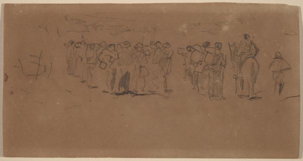 Winslow Homer rendered "Officers and Horses at Rest" with graphite on paper. Notice how Homer uses delicate lines to define the forms of soldiers and their horses. The composition is divided into two distinct registers, each presenting a different arrangement of figures. Homer uses line and form to capture a sense of quietude amidst the potential chaos of military life. The sketch-like quality destabilizes the traditional heroic depictions of war, offering a more intimate, human perspective. The absence of dramatic action shifts our focus to the subtle interactions between the officers and their mounts. The linear quality of the work invites us to consider the structured relationships between the figures and their environment. This piece functions not only as a visual record but also as a commentary on the psychological space of men at war, subtly conveyed through the structural elements of line and composition.