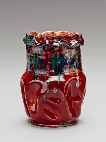 This vase was crafted by George Ohr, sometime in the late 19th or early 20th century. Note how its deep crimson glaze immediately captures your attention. The form itself defies conventional symmetry, presenting an almost crumpled silhouette. Ohr was known as the "Mad Potter of Biloxi", and this piece exemplifies his radical approach to ceramics. The pinched and folded lip, the undulating surface texture, and the playfully shaped handles challenge our traditional notions of what a vase should be. It's more than a vessel; it's a statement. Ohr's work disrupted the established aesthetic values of his time. He engaged with new ways of thinking about form and function. He challenged the fixed meanings and categories we impose on art and craft. Look closely at how Ohr subverts the smooth, refined finish typically associated with pottery, creating a complex interplay between order and chaos. This vase, therefore, functions not just as an object of beauty, but as a profound philosophical statement.