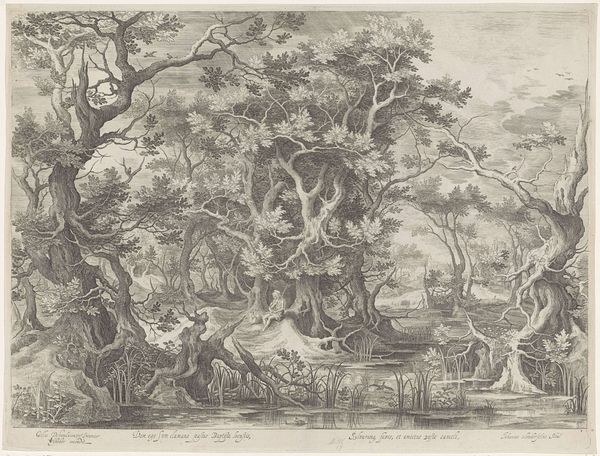 Jan van Londerseel created this print, Landschap met de dood van de ongehoorzame godsman, sometime between 1575 and 1625, using an engraving technique. It’s a stark, graphic medium; it's all about the sharp line. The material qualities here – the dark ink, the crispness of the impression on the page – lend themselves to a sense of moral clarity. Londerseel has used cross-hatching and fine strokes to build up a detailed landscape, filled with gnarled trees that dominate the scene. Engraving is an intensive process. The artist uses a tool called a burin to cut lines directly into a metal plate. The plate is then inked, and the ink is caught in the engraved lines. When the plate is pressed against paper, the image is transferred. The precision and control required speak to the engraver’s skill. It is a labor-intensive method well suited to conveying the story of punishment; the unforgiving, etched lines underscore the consequences of disobedience. The print is not just a picture, but evidence of a complex, demanding process, making it all the more powerful.