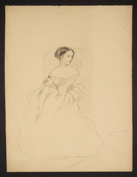 Curator: This is a sketch by Charles Martin, likely executed in the mid-19th century, now residing in the Tate Collections. It captures a seated woman in delicate lines. Editor: There's a vulnerability to it. The sitter seems both present and a little distant, her gaze is soft, but there's a quiet strength in her posture. Curator: Absolutely. Consider the power dynamics inherent in portraiture of this era. Who gets depicted, and how? This image is intriguing because it feels so personal, avoiding grandiosity. Editor: The lack of ostentation is notable. It makes me wonder about the woman’s social position and how she is choosing to represent herself to the artist, or perhaps how he’s choosing to see her. Curator: Precisely! It prompts us to think about identity, about how women negotiated societal expectations through visual representation. Editor: It’s remarkable how much information and emotion is conveyed with so few lines. Curator: Indeed, a study in understated elegance. Editor: A glimpse into a life, elegantly rendered.