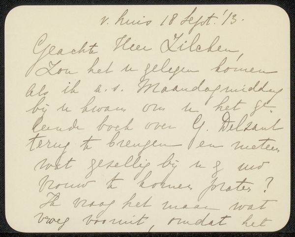 This is "Brief aan Philip Zilcken," by Johannes de Koo. The letter presents itself as a constellation of lines and forms, carefully arranged. The dark ink contrasts starkly against the pale paper, creating a play of positive and negative space. Notice how the deliberate strokes give shape to words and ideas, and how the script’s rhythm almost dances across the surface. Here, the act of writing becomes a performance of thought and feeling; the loops and curves destabilize conventional communication. In this piece, De Koo is not just conveying information; the artist is exploring the very materiality of language and its ability to transcend mere denotation. The formal qualities of the handwriting reveal a deeper layer of expression beyond the literal content of the message. The letter is less a straightforward message, and more an artifact of human expression.