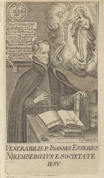 Curator: Here we see "Portret van Gemma Frisius," an engraving crafted by Jan van Stalburch around 1557. It's currently housed in the Rijksmuseum. My initial impression is that it has a slightly austere mood, punctuated by the intricacy of the scientific tools surrounding Frisius. What catches your eye first? Editor: The density of information strikes me – it's overwhelming in the way that Renaissance intellectualism often was. The portrait serves as an assertion of Gemma Frisius’s intellectual status within a specific, and very male, academic milieu. Look at how knowledge itself becomes a form of symbolic capital displayed so prominently. Curator: Indeed, the composition is remarkably effective. Stalburch's precise lines highlight Frisius’s contemplative pose as he examines a globe. There’s an emphasis on texture—the rendering of his clothing, the crisp edges of the books in the background. Each object contributes to a broader understanding of his persona. Editor: But beyond the surface textures, I find myself questioning whose image this engraving truly serves. Is it solely a testament to Frisius, or also a validation of the patron and the engraver? The inscription seems laudatory, almost hagiographic. How much of the subject's actual contributions or beliefs are suppressed or skewed to fit prevailing ideological currents? Curator: That is a valid point. Focusing on the intrinsic qualities, we observe the symbolic language of the objects - books, instruments. They all speak to the humanist dedication to knowledge and scientific exploration that characterized the period. Stalburch has clearly composed an image to evoke respect and intellectual authority. Editor: Precisely. And considering that historical context—the burgeoning printing industry and the Reformation—dissemination of images carried immense political weight. How would a piece like this have been read in different circles? Would it have been viewed as simply a neutral celebration of knowledge, or might some have perceived an implicit alignment with humanist, potentially reformist ideas? It certainly opens up interesting possibilities. Curator: An enriching point to consider, indeed. It's precisely this fusion of visual and intellectual elements that render it an outstanding piece. Editor: Absolutely, a portrait deeply embedded in the cultural and political complexities of its time, making it much more than a simple representation.